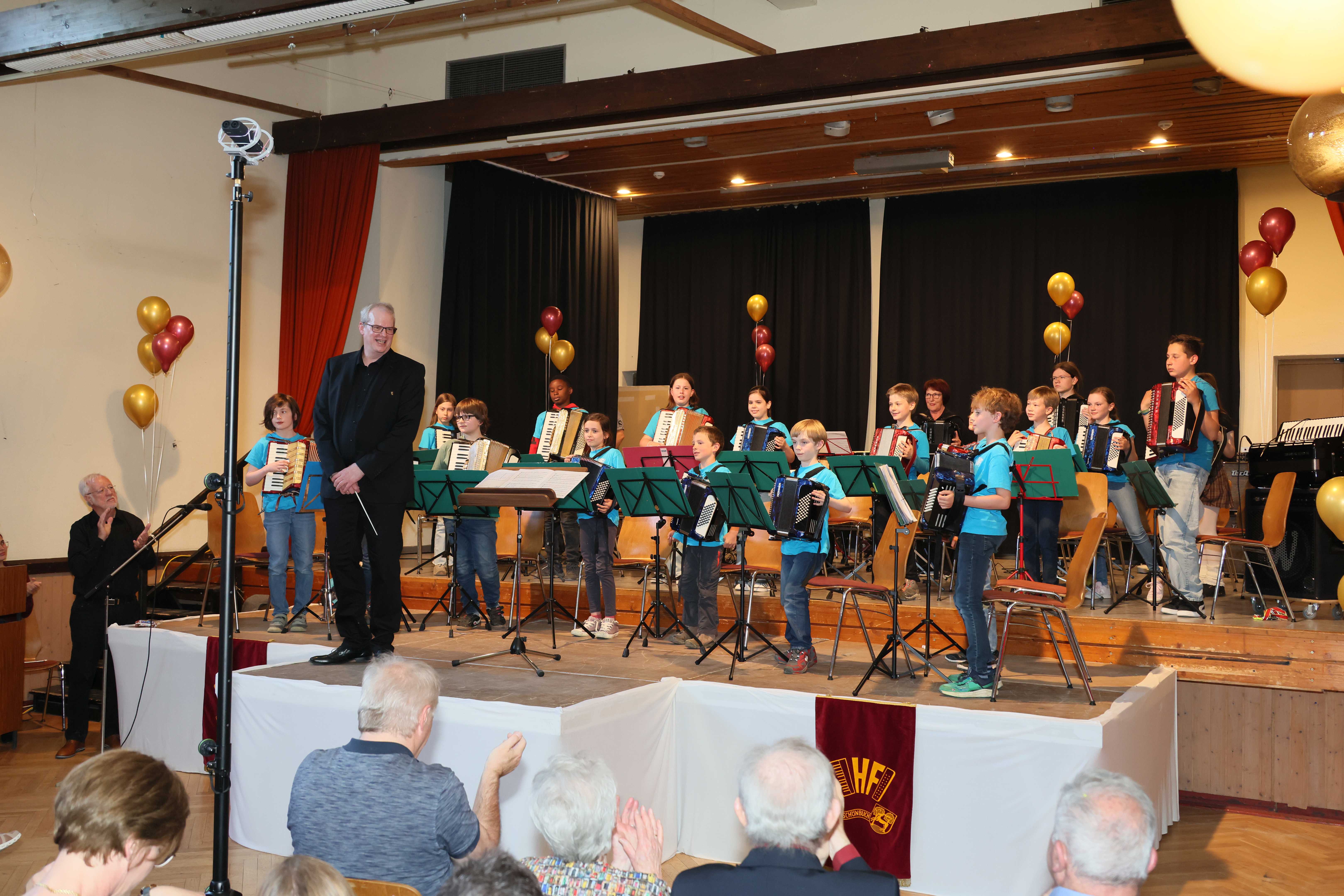 wie schnell vergeht doch so ein Schuljahr! Im Oktober 2024 starteten wir mit drei Akkordeon-AGs in den Schulen Weil und Breitenstein. Jetzt im Juli 2025 enden diese AGs und dieses Ende sollte nicht "klanglos" sein. Martin Hauke, unser musikalischer Leiter, hatte sich etwas ganz Besonderes einfallen lassen. Er komponierte für die Kinder der Akkordeon-AGs und unser neues Schülerorchester das Stück "Beginner Suite" und es fanden in den letzten Wochen gemeinsame Proben statt. Am 16. Juli 2025 war es dann soweit. Eltern, Großeltern und Geschwister waren zu dem "Kleinen Konzert" im Haus der Musik eingeladen um zu hören, was einstudiert worden war. Sie waren erfreulicherweise sehr zahlreich gekommen. Nach der Begrüßung durch unseren 1. Vorsitzenden, Dieter Staiger, und erklärenden Worten des Komponisten zu seinem Projekt bereits während der AGs, die AG-Kinder ins Orchesterspiel mit unterschiedlichen Stimmen einzuführen, gab es zunächst drei mutige Akkordeonspieler aus den AGs, die den Fortschritt während des Jahres zeigten.