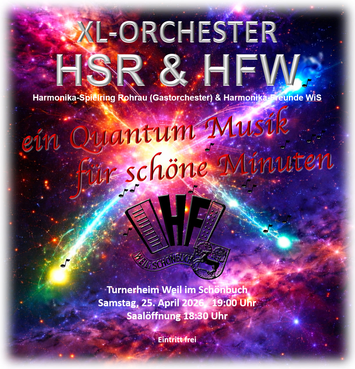 Die HFW bilden zusammen mit unserem Gastorchester "Harmonika-Spielring Rohrau e.V." (HSR) ein „HSR-HFW-Ensemble“ sowie ein „XL-Orchester HSR & HFW“.